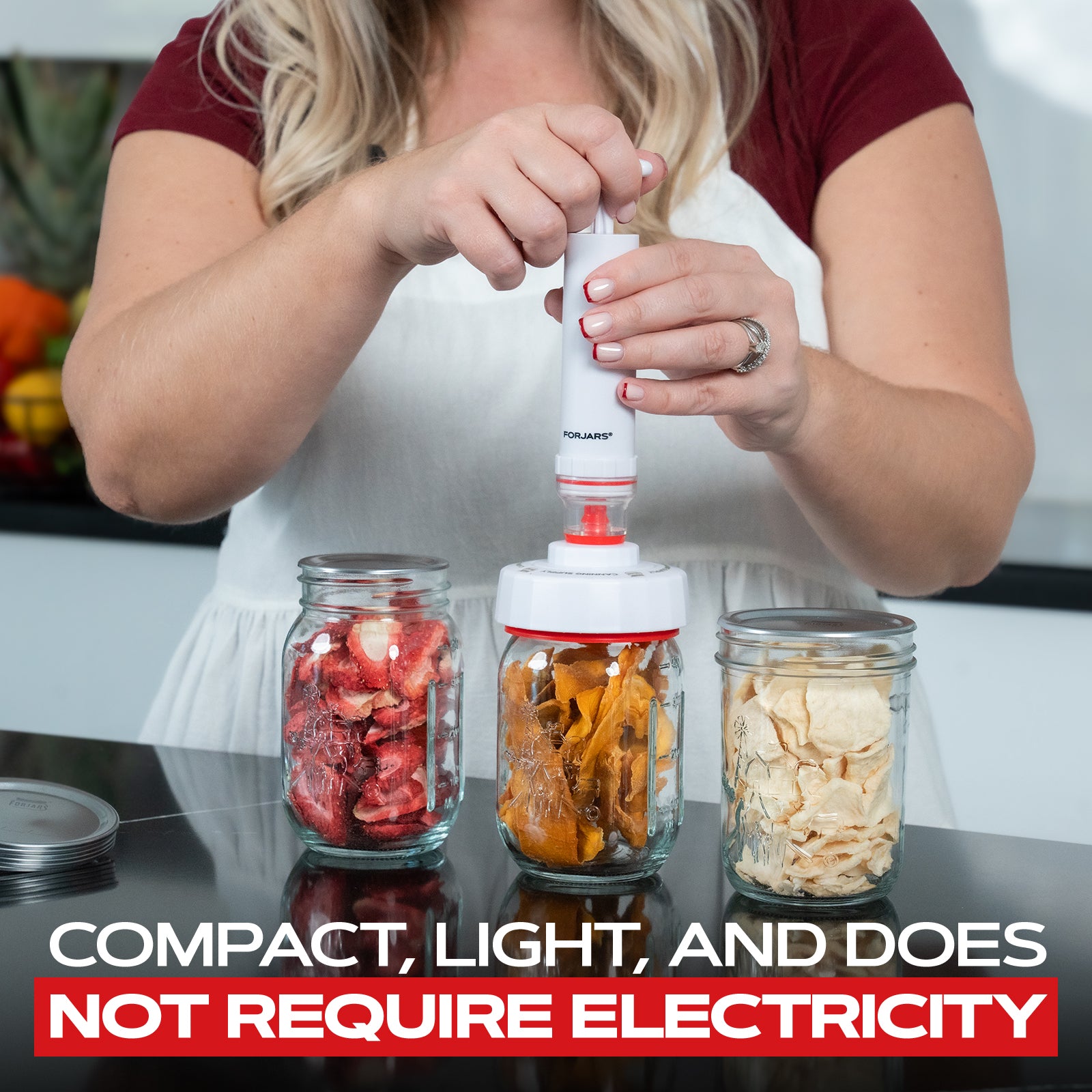 Keep your food fresh longer by pulling air out of the mason jars and preserving the freshness of your sauces, mustards, jams, grains, nuts, and more.