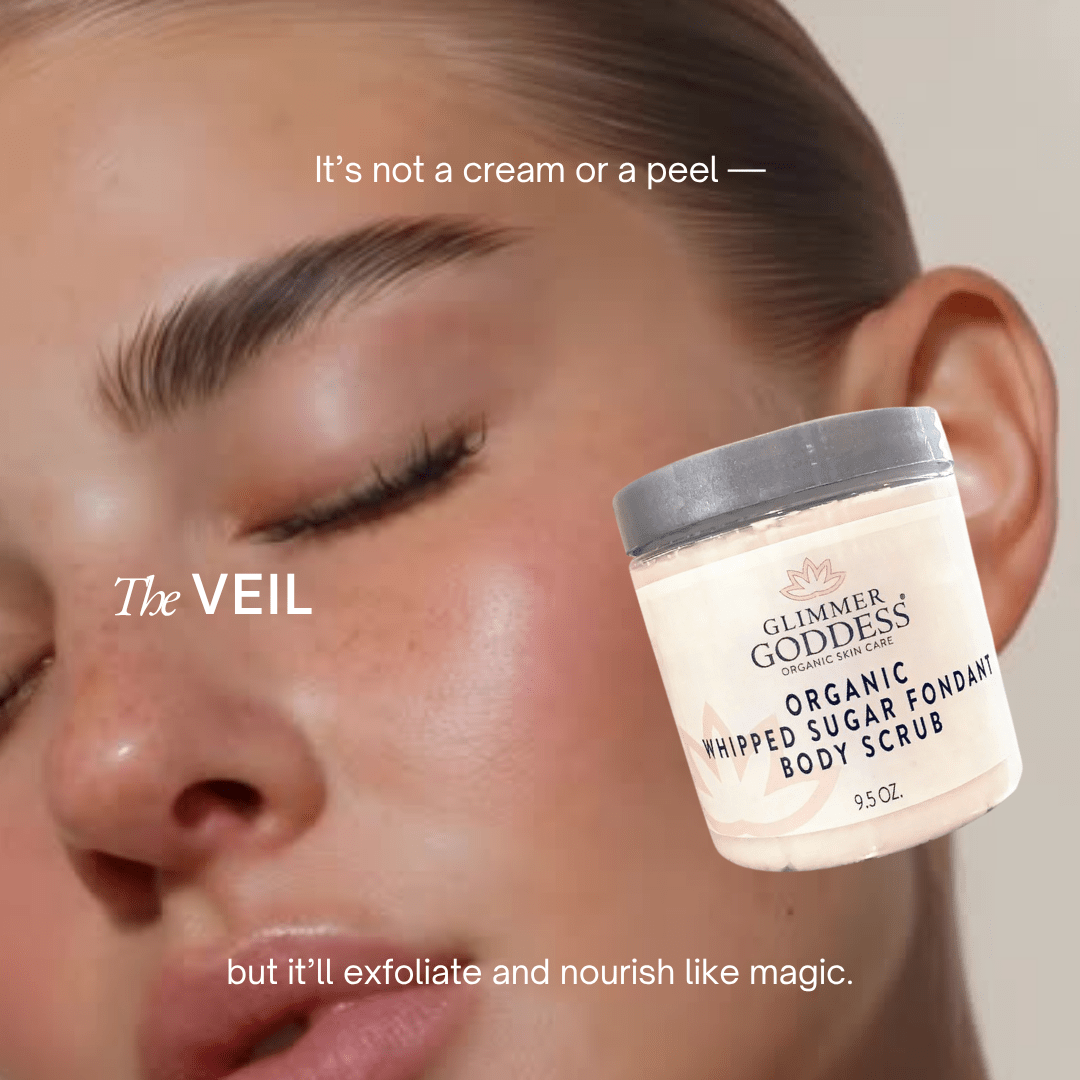 Enliven your skin with Glimmer Goddess Organic Whipped Sugar Fondant Exfoliating Body Scrub! Our Sugar Scrub gently exfoliates, removing dead skin cells and boosting collagen production, which helps improve skin elasticity and reduce the appearance of crepey skin for a smoother, firmer look. This all-natural scrub gently exfoliates, hydrates, and nourishes for radiant, smooth, and even skin. Made with Coconut Oil, Sweet Almond Oil, and Vitamin E, and enriched with glycolic acid to unclog pores. Say hello to glowing, healthy skin!