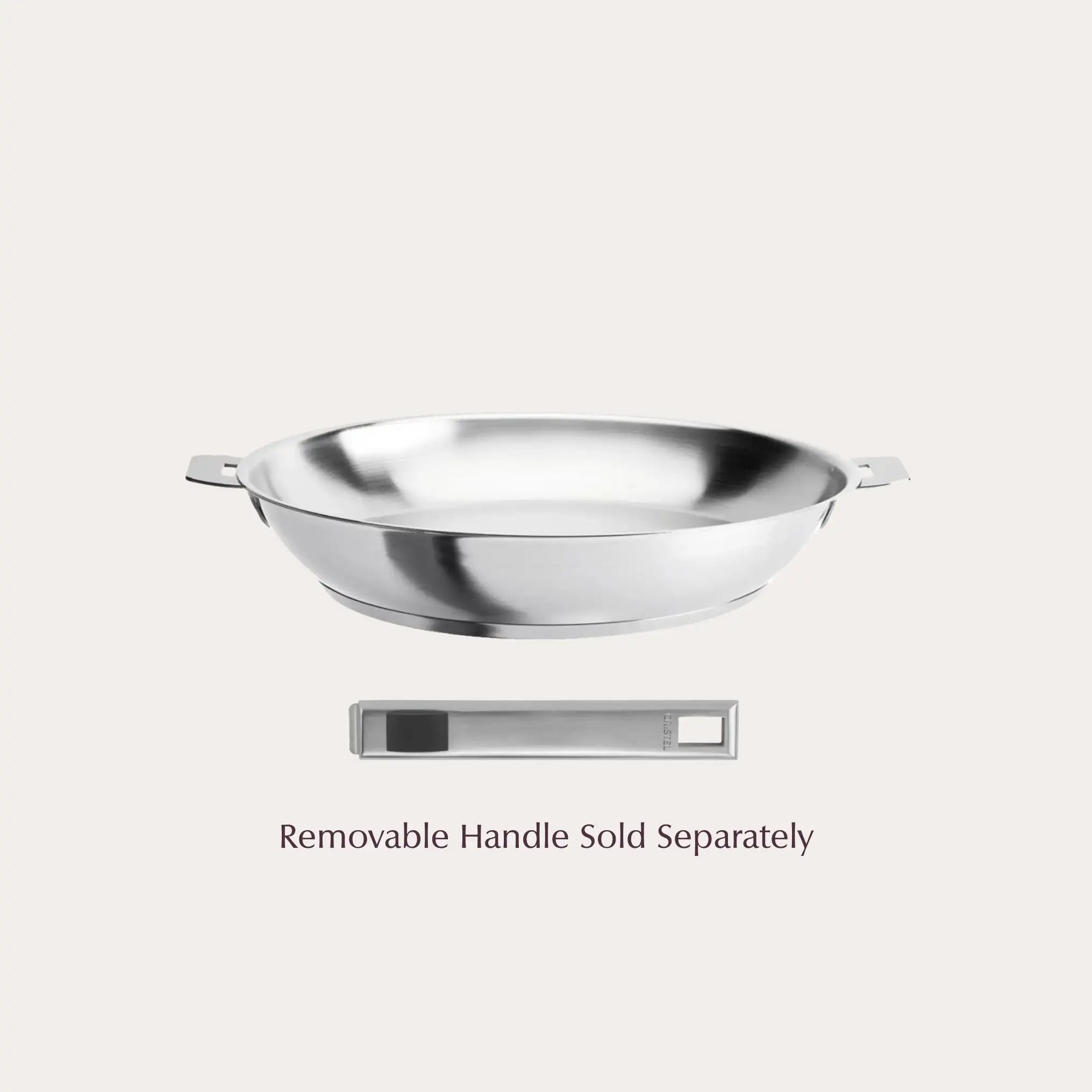 Stainless steel Deep Frying pan 18/10, brushed finish, detachable handle, from Strate®collection. A must have in the kitchen, Strate®Deep frying pans are available in 2 sizes: 9.5” and 11”. Ideal for searing meat and cooking in liquid, stainless steel deep frying pans with detachable handles allow, thanks to the quality of their diffuser base, to cook perfectly without water or oil or fat.