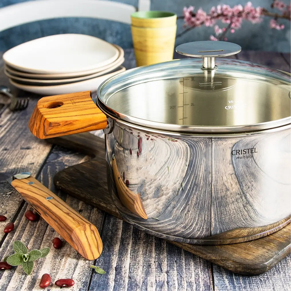 Made in stainless steel and wood, the detachable handles ensure safety and modularity in your kitchen. By switching the long handle with side handles, each vessel becomes an elegant serving dish.