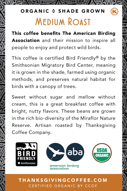 Each package sold benefits the American Birding Association's programs. By drinking shade-grown and bird friendly certified coffee every morning, you are supporting these coffee farmers, the efforts of the ABA, and the countless birds they are protecting through community outreach and conservation. Learn more.