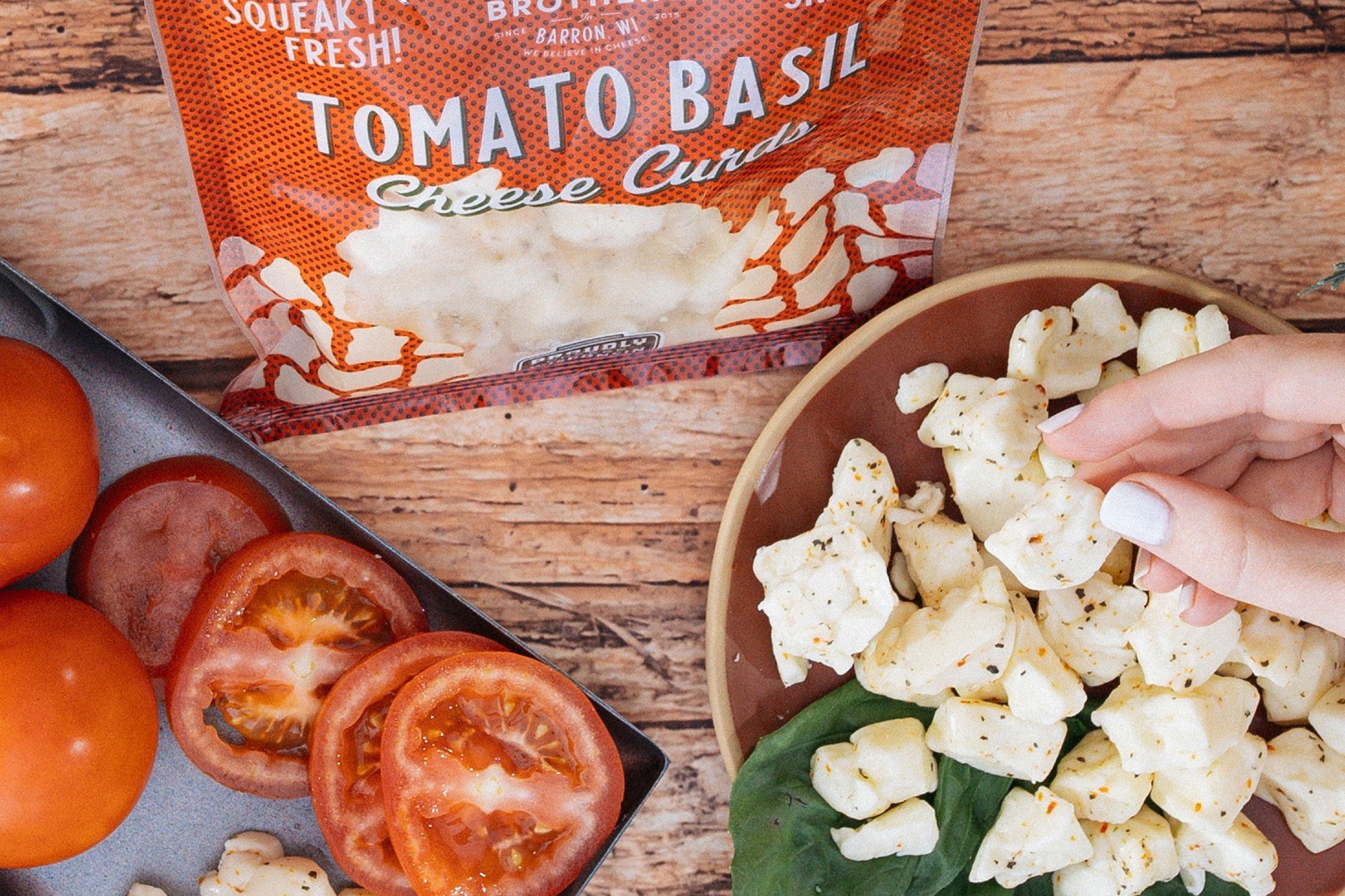 - Three 8 oz. bags of freshly made to order Wisconsin cheese curds (2x Tomato Basil and Hot Pepper).