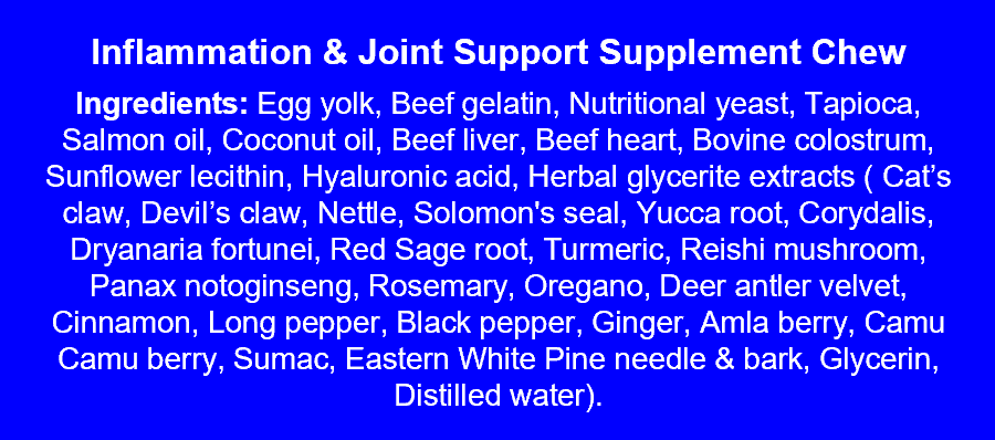 Egg yolk, beef gelatin, nutritional yeast, tapioca, salmon oil, coconut oil, beef liver, beef heart, Bovine colostrum, Subflower lecithin, Hyaluronic acid, glycerin, distilled water, cat’s claw, devil’s claw, nettle, Solomon’s seal, yucca root, corydalis, turmeric, reishi, rosemary, oregano, deer antler, cinnamon, black pepper, amla, camu camu, sumac, pine needles and pine bark.