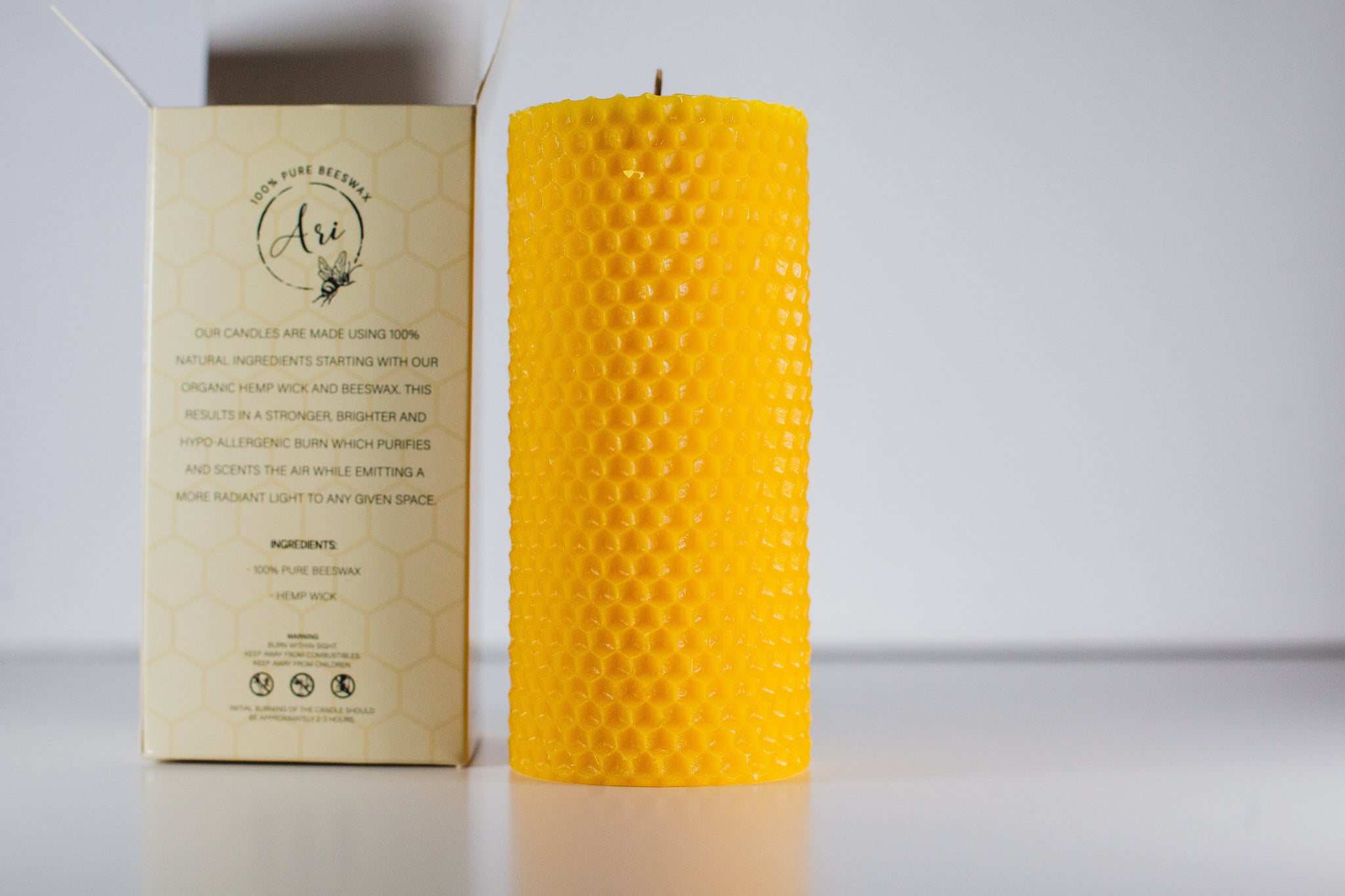 100% Pure Beeswax Candle- 5" Tall by 2” wide 10 oz Honeycomb pattern pillar. Hemp Wick- Naturally scented by bees. Hints of honey from the honeycomb.