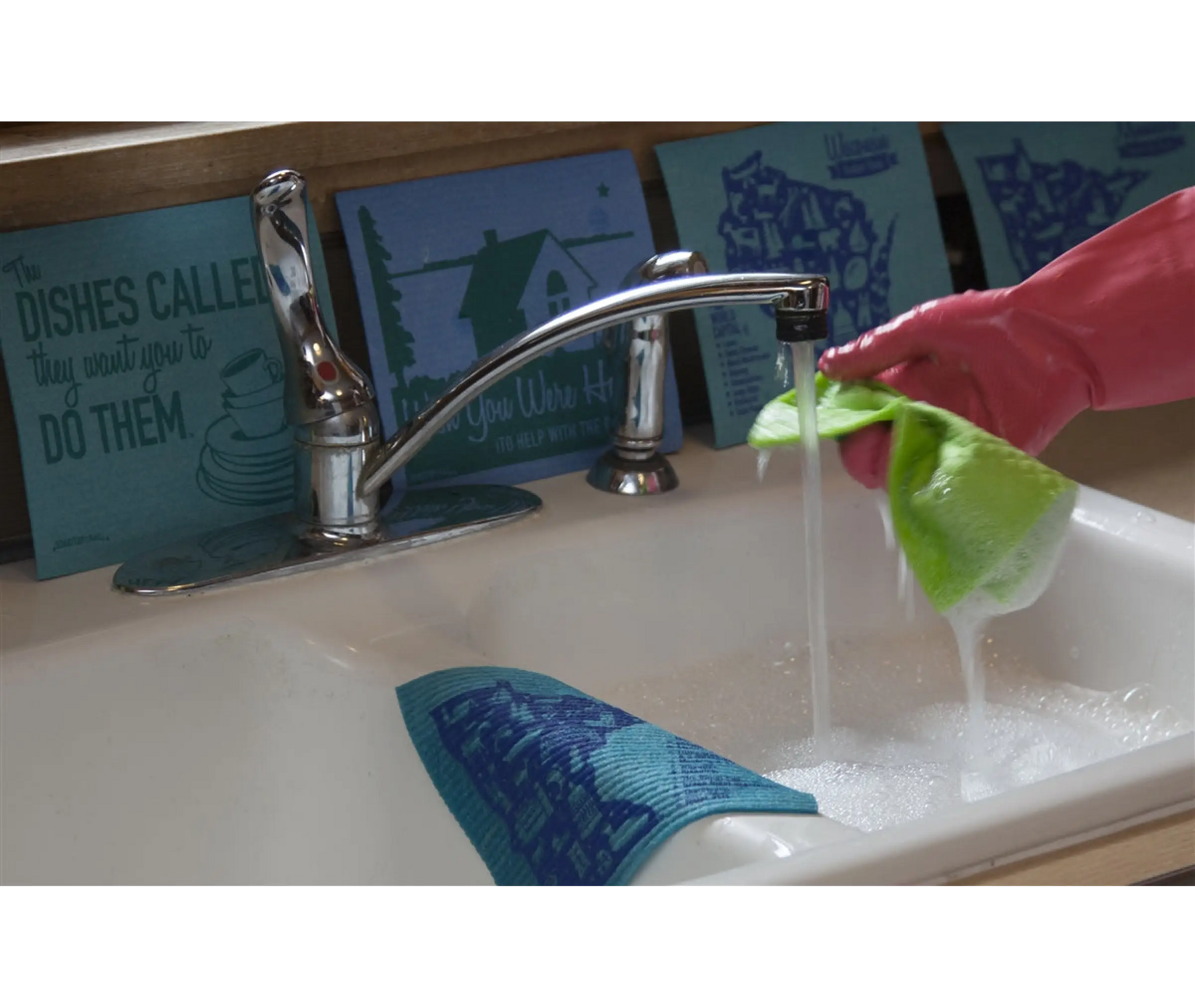 Bright colored Swedish style Soak it Up Cloths are your clever compostable cleaning companion. Our unique designs are environmentally friendlier than similar cloths because we use one color printing to cut down on manufacturing materials and ink. Do your part, use ultra-eco Soak it Up Cloths.