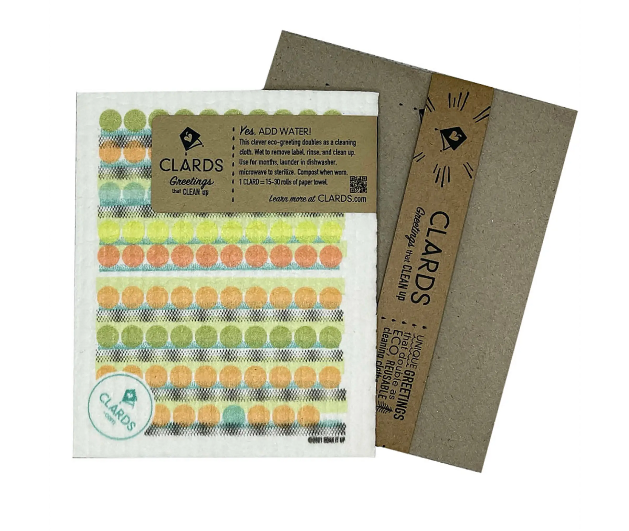 Inside Non-velope: You Got a CLARD! This unique greeting doubles as an eco-friendly reusable cleaning cloth. Read it. Rinse it. Enjoy it for months. Use it to clean spills, wash dishes, or scrub surfaces. Compost it when it’s worn out.