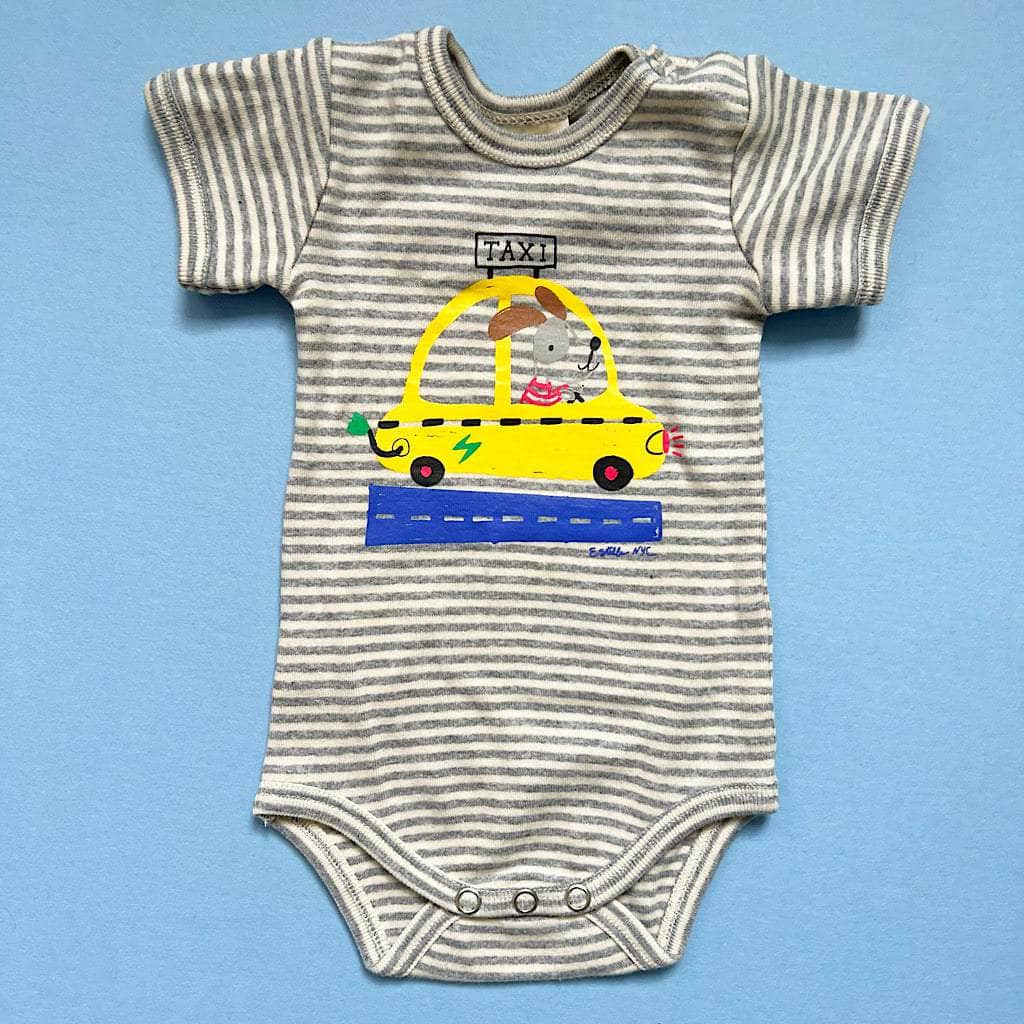 Estella's organic cotton taxi baby one-piece is ideal for the city-dwelling babe! Made with the super soft organic cotton, this baby bodysuit features a graphic of the iconic NYC taxi cab on its front (now electric to save the planet!) with Frank the taxi dog at the wheel. Includes snaps between the legs and on the left shoulder for easy removal. Pair it with any of Estella's New York-themed baby toys for a complete baby gift set!