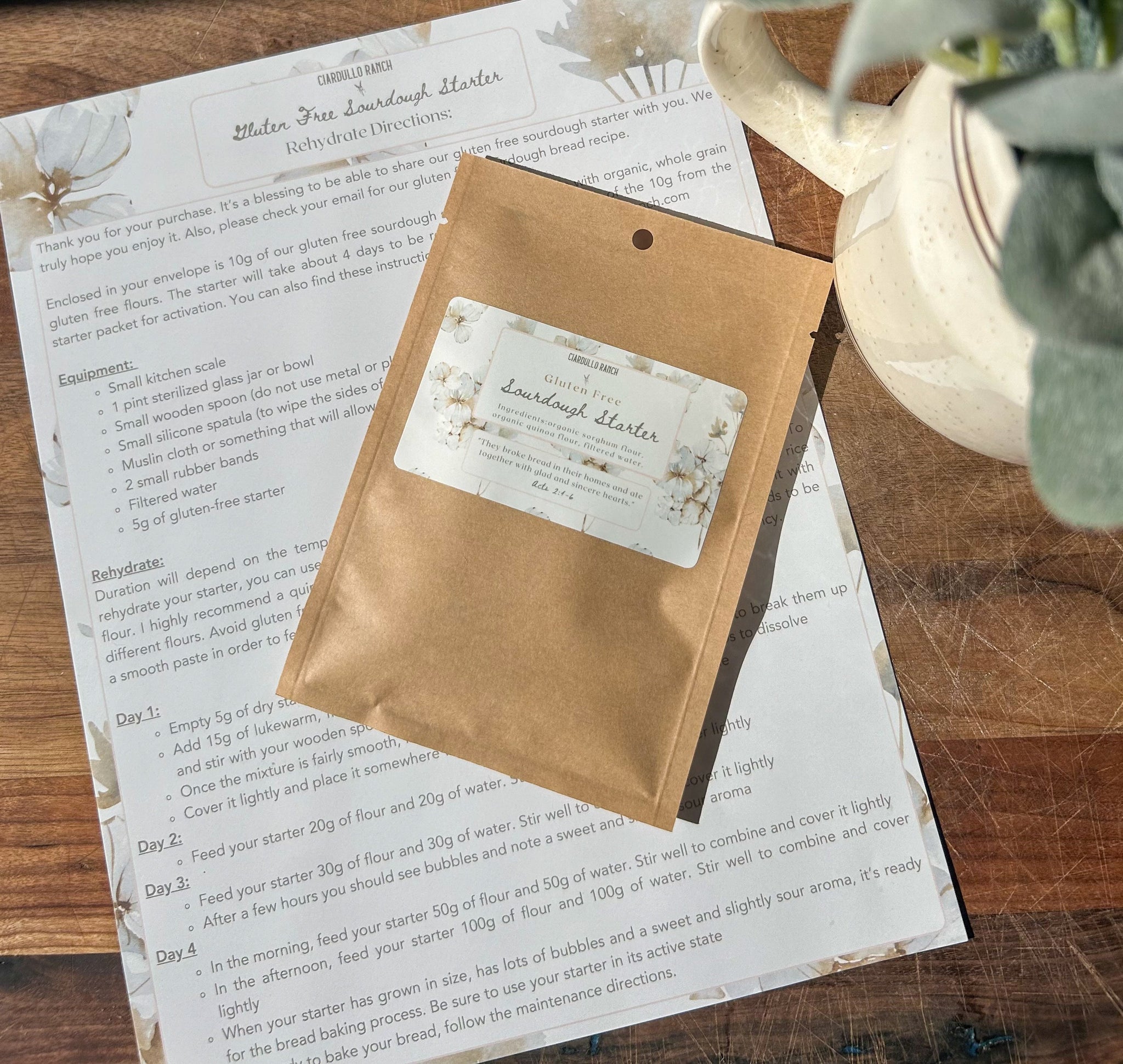 Our organic, gluten-free dehydrated sourdough starter is handcrafted, ready to use, and comes with step-by-step rehydrate and maintenance directions. It contains filtered water, organic sorghum, and organic quinoa flours, all prepared in a gluten-free kitchen. We are honored to share this God-given marvel with you, carefully developed by Erica, who has Celiac disease.